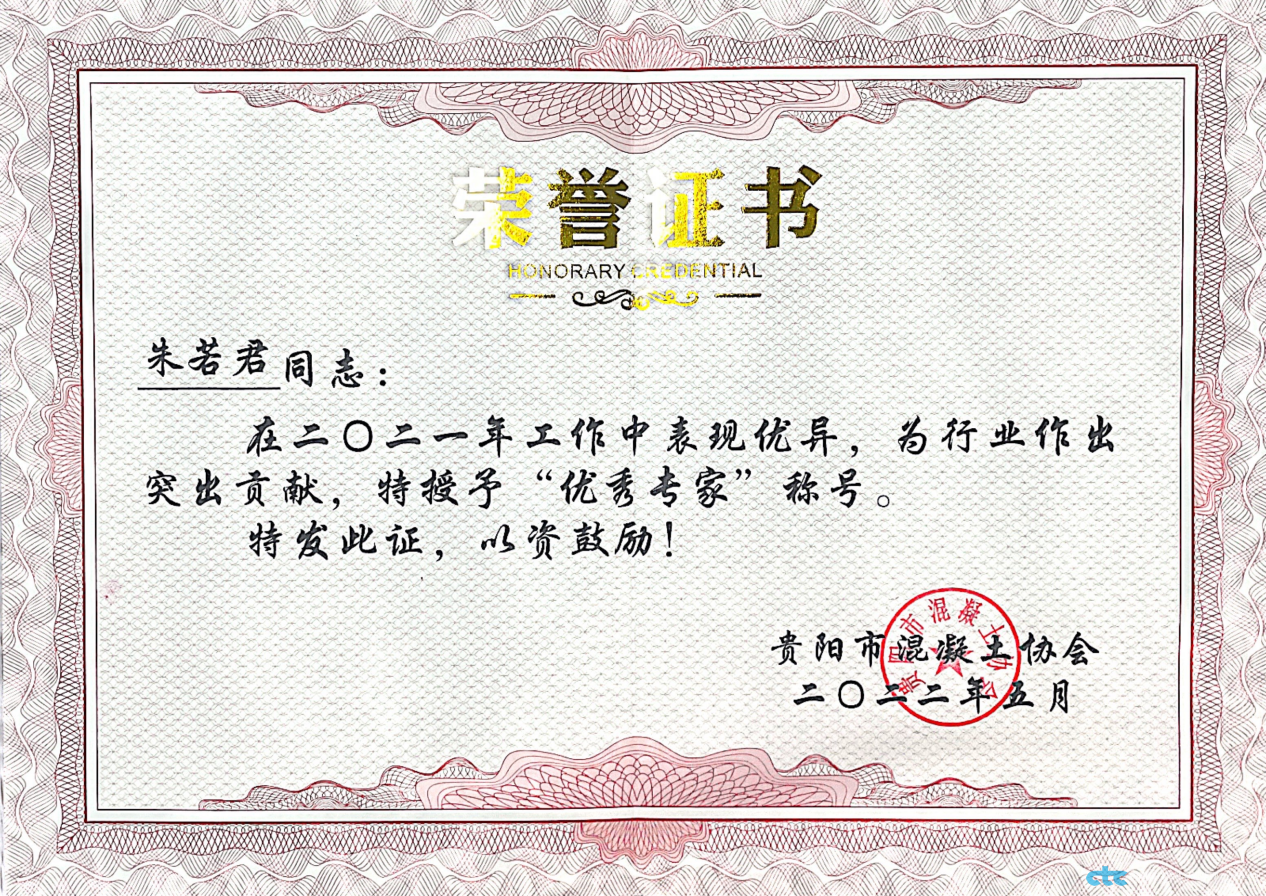 國檢集團貴州公司員工榮獲貴陽市混凝土協(xié)會授予的 “2021年度優(yōu)秀專家”榮譽稱號
