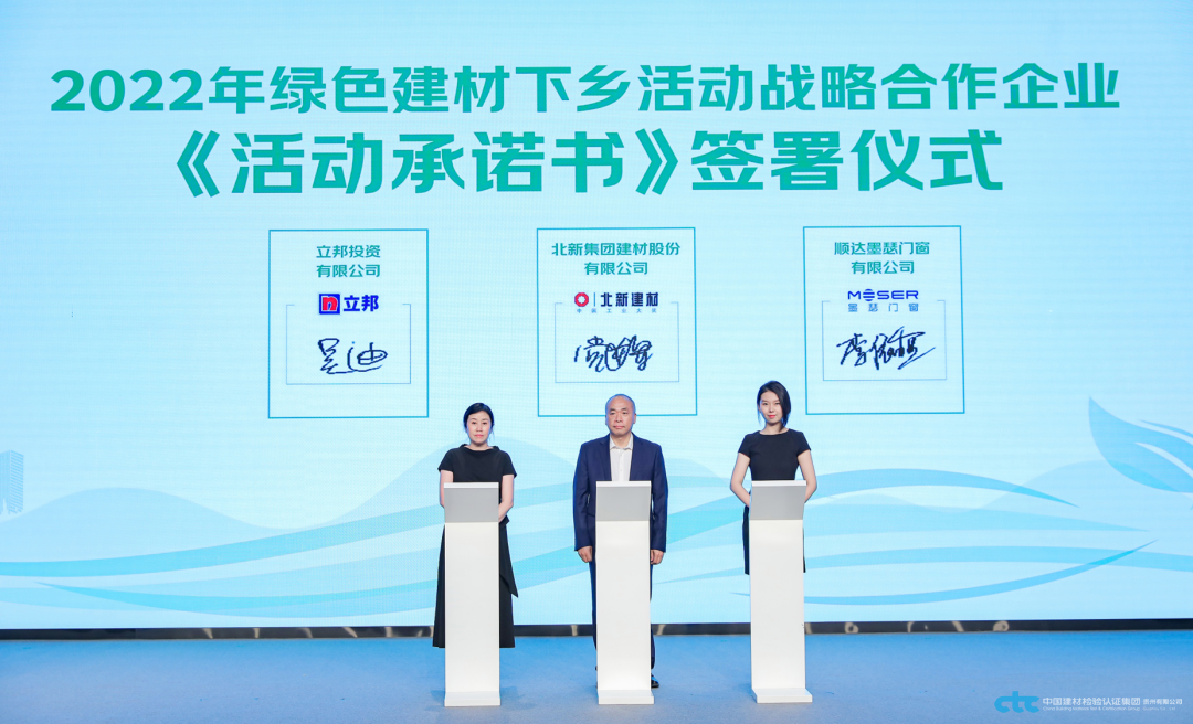會上還發布了首批2022年綠色建材下鄉活動產品清單及企業名錄,正式啟動了綠色建材下鄉活動公共信息發布平臺及京東線上平臺,并對下一步工作進行了總體安排。國檢集團綠色建材產品認證客戶北新集團建材股份有限公司、立邦投資有限公司、順達墨瑟門窗有限公司的代表共同簽署了活動參與承諾書,承諾確保參加活動的產品及服務質量,積極配合開展綠色建材下鄉活動,充分發揮引領示范作用。